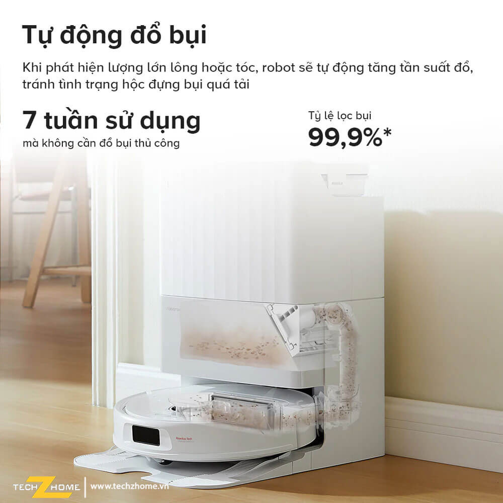 Khi phát hiện lượng lớn lông hoặc tóc, robot sẽ tự động tăng tần suất đổ, tránh tình trạng hộc đựng bụi quá tải và cho phép sử dụng liên tục đến 7 tuần mà không cần đổ bụi thủ công, với khả năng lọc bụi đạt 99,9%.
