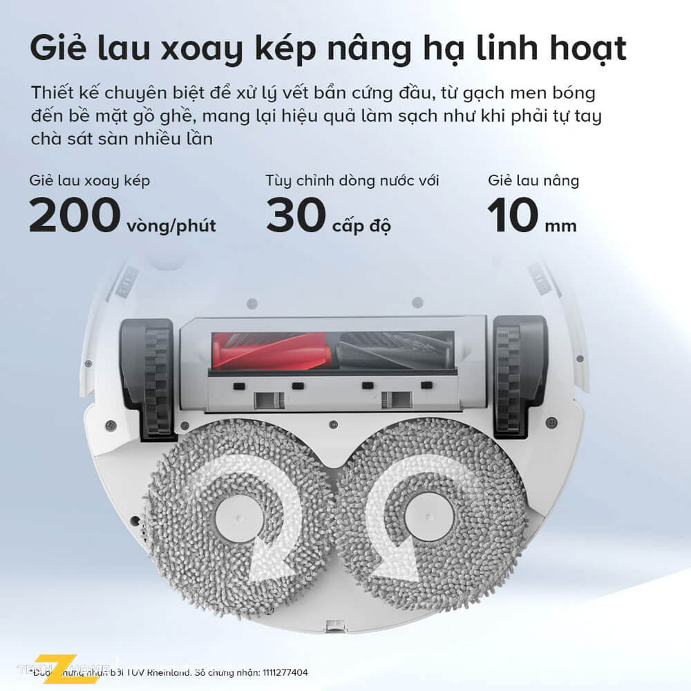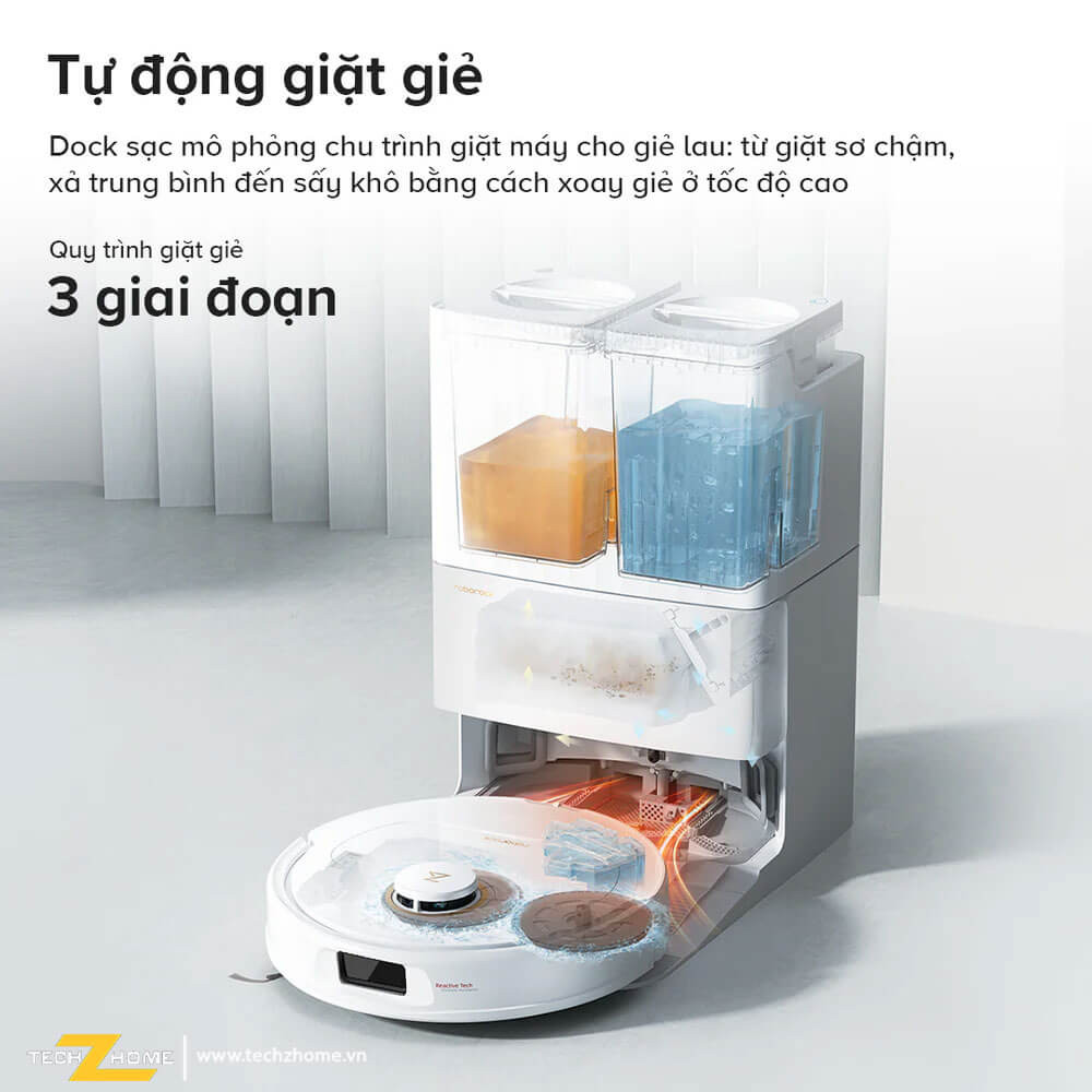 - Giặt giẻ nước nóng 75°C - Sấy khô khí nóng 45°C - Hút rác tự động lên túi chứa |