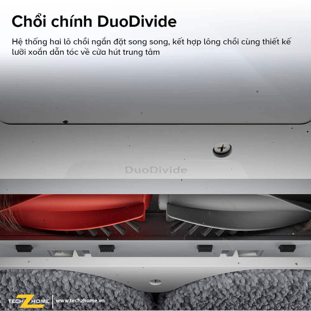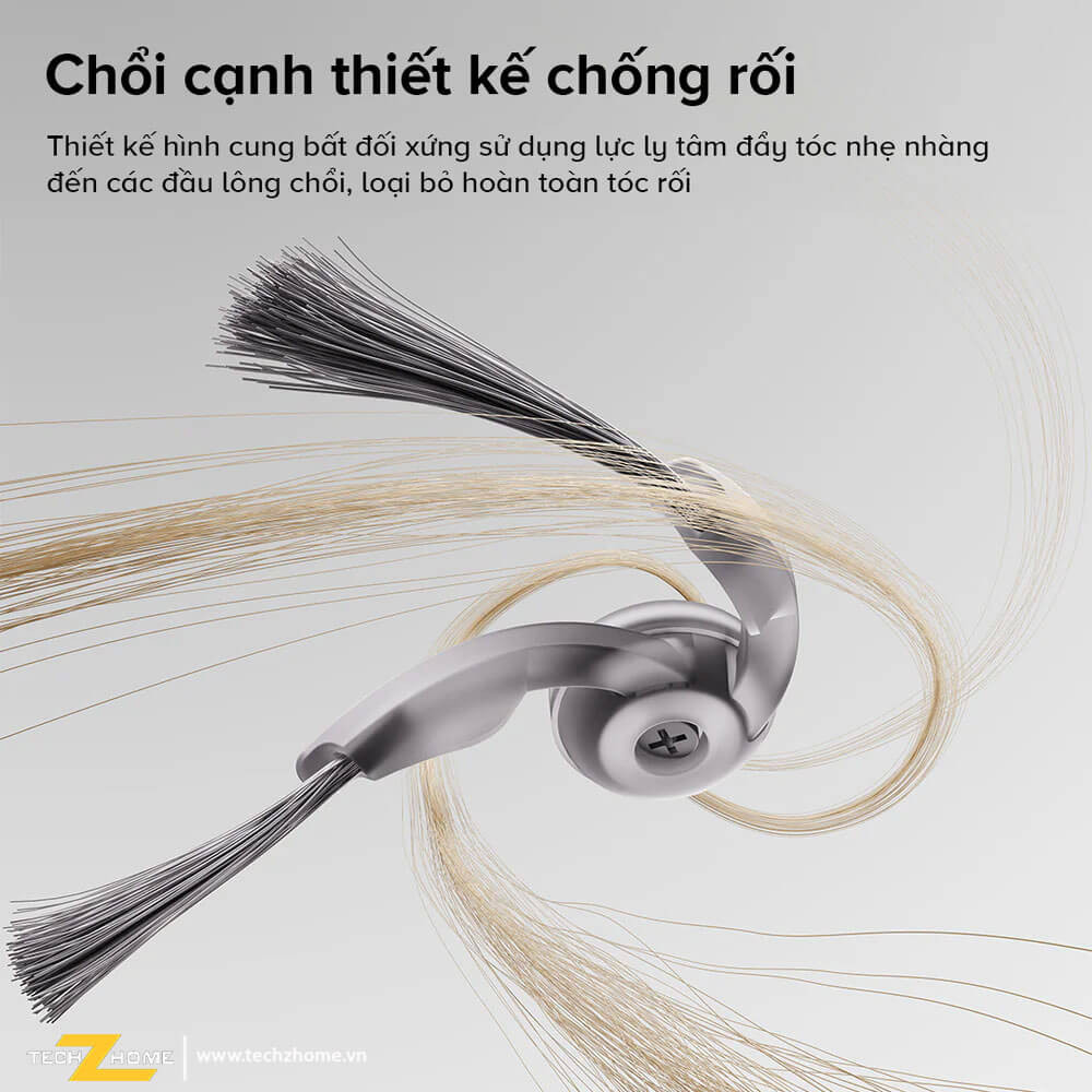 Hệ thống hai lô chổi ngắn đặt song song, kết hợp lông chổi cùng thiết kế lưỡi xoắn dẫn tóc về cửa hút trung tâm