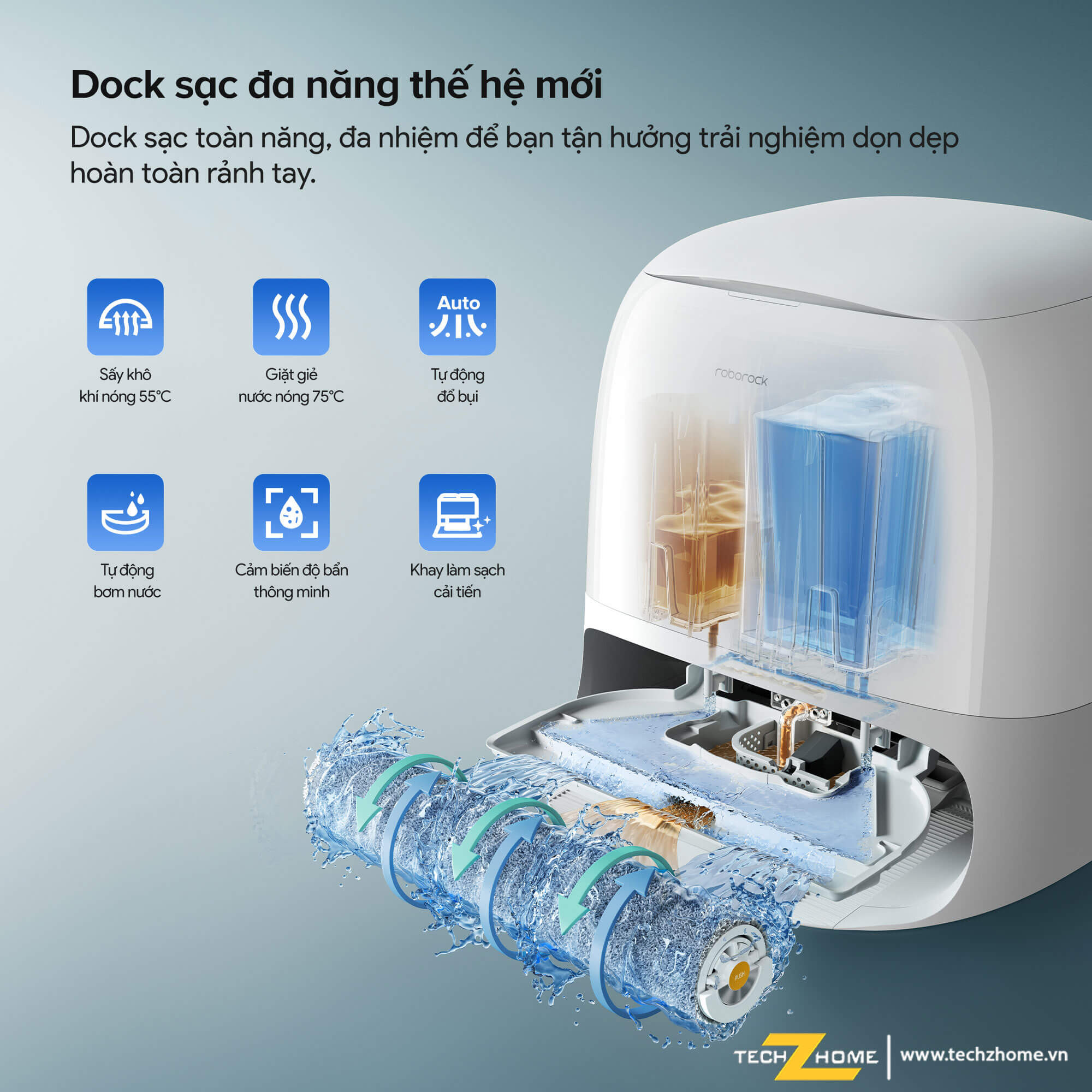 - Giặt khăn lau bằng nước nóng: 75°C - Sấy khô khăn lau bằng khí nóng: 55°C - Tốc độ con lăn: 220 vòng/phút - Điều khiển từ xa: Qua ứng dụng Roborock - Điều khiển bằng giọng nói - Camera đàm thoại 2 chiều |