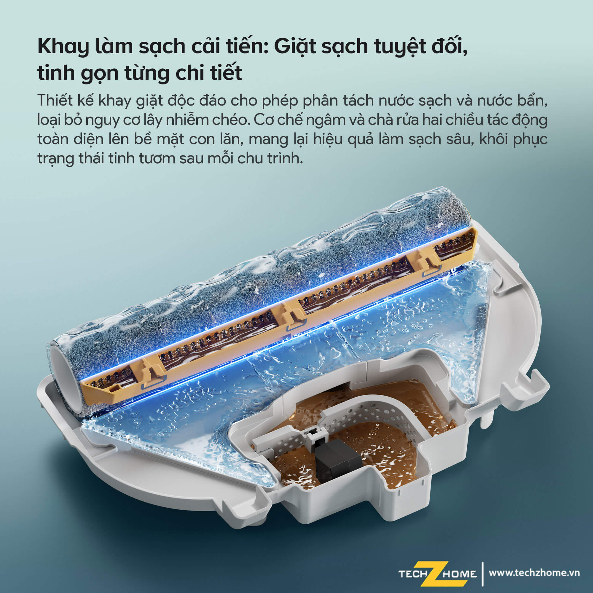 Thiết kế khay giặt độc đáo cho phép phân tách nước sạch và nước bẩn, loại bỏ nguy cơ lây nhiễm chéo. Cơ chế ngâm và chà rửa hai chiều tác động toàn diện lên bề mặt con lăn, mang lại hiệu quả làm sạch sâu, khôi phục trạng thái tinh tươm sau mỗi chu trình.