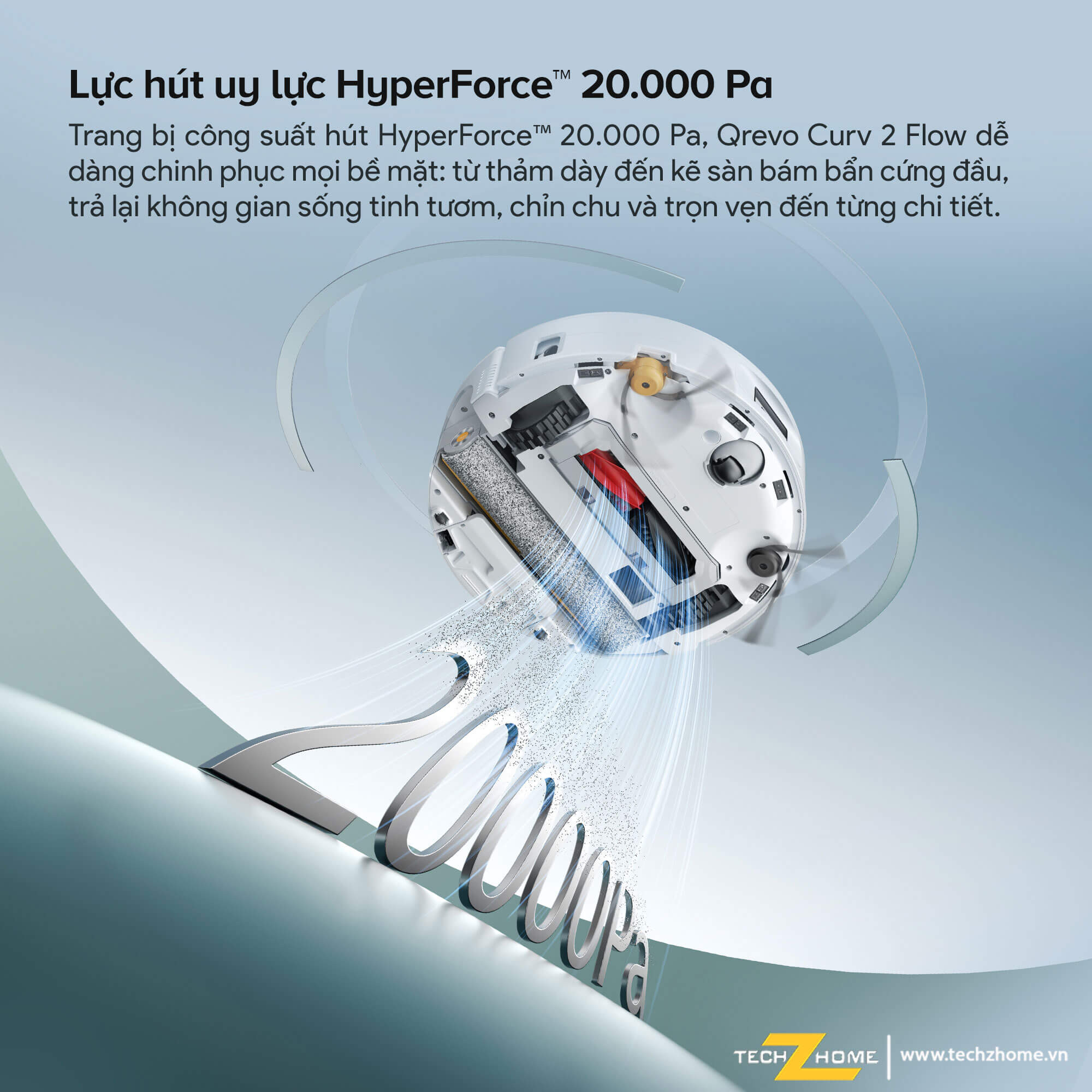 Trang bị công suất hút HyperForce™ 20.000 Pa, Qrevo Curv 2 Flow dễ dàng chinh phục mọi bề mặt: từ thảm dày đến kẽ sàn bám bẩn cứng đầu, trả lại không gian sống tinh tươm, chỉn chu và trọn vẹn đến từng chi tiết.