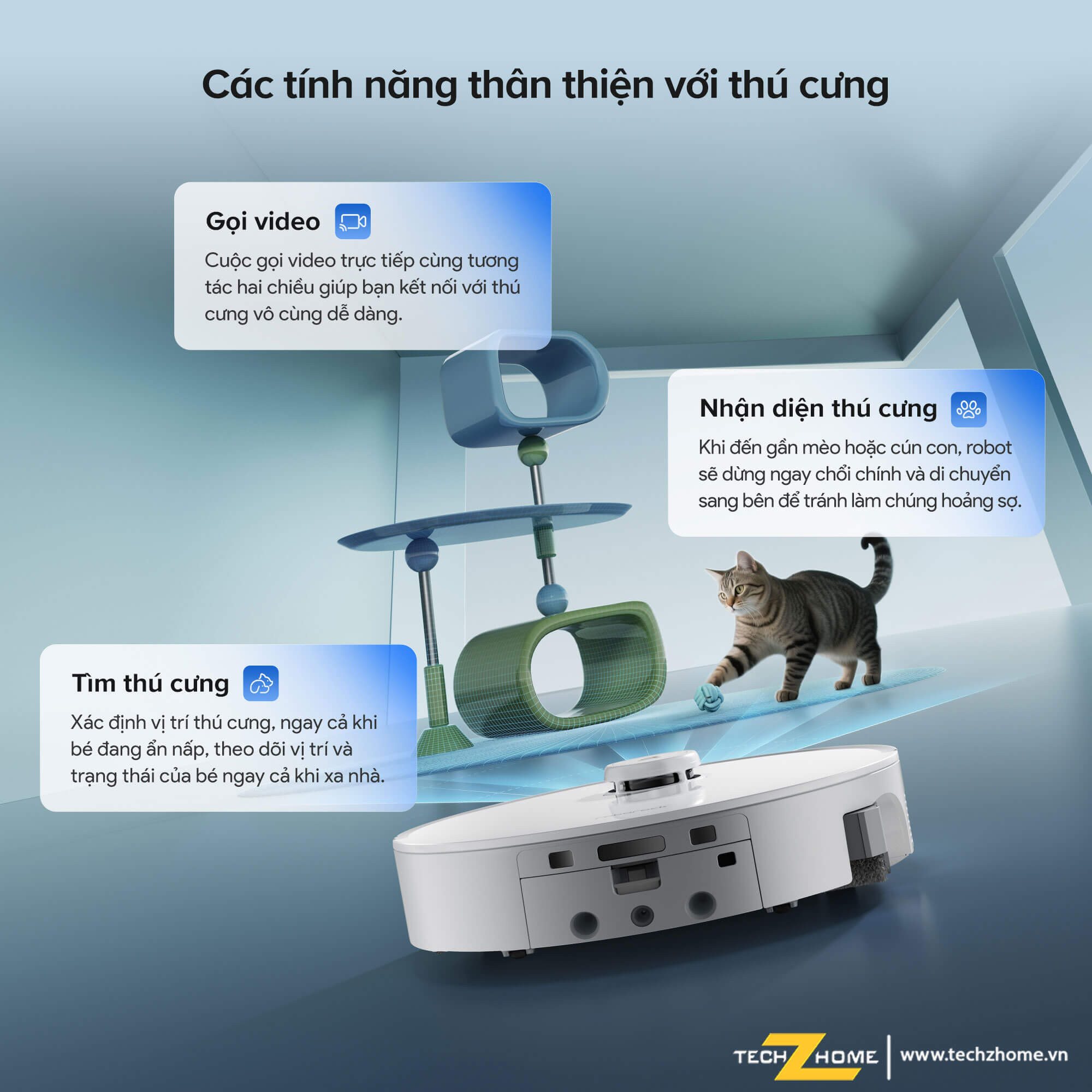 - Nhận diện thú cưng: Khi đến gần mèo hoặc cún con, robot sẽ dừng ngay chổi chính và di chuyển sang bên để tránh làm chúng hoảng sợ.