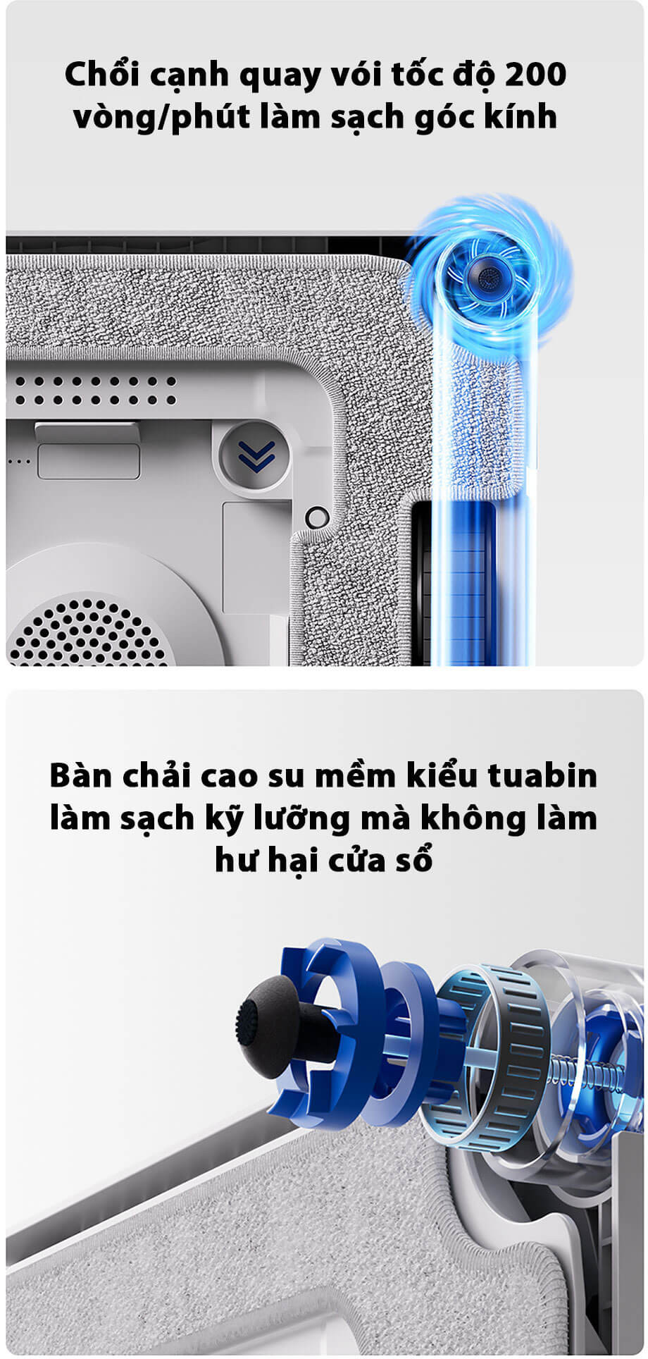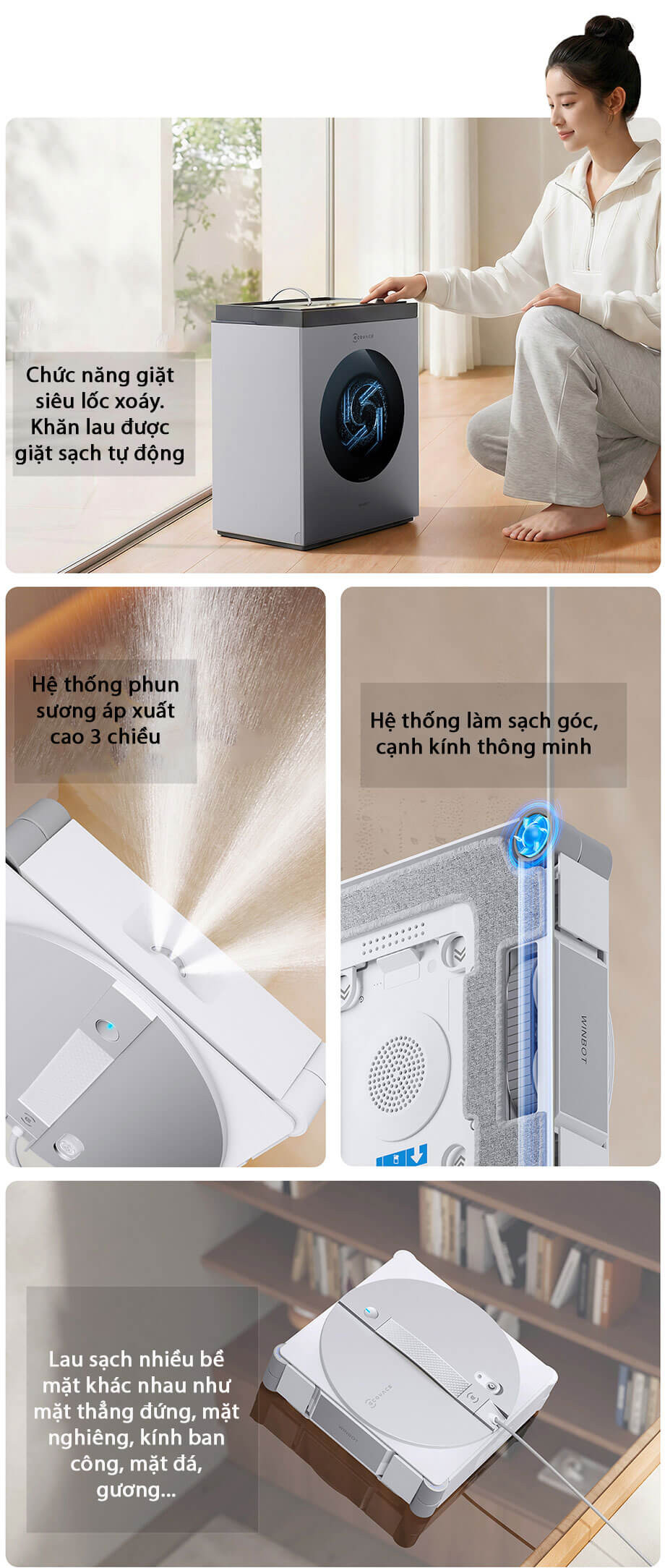 - Giặt khăn lau tự động - Lau các bề mặt: Kính, gương, tường ốp đá, gạch men ốp tường - Lau các bề mặt thẳng đứng, nghiêng, kính mặt trong, mặt ngoài - Có thể vừa sạc vừa sử dụng |