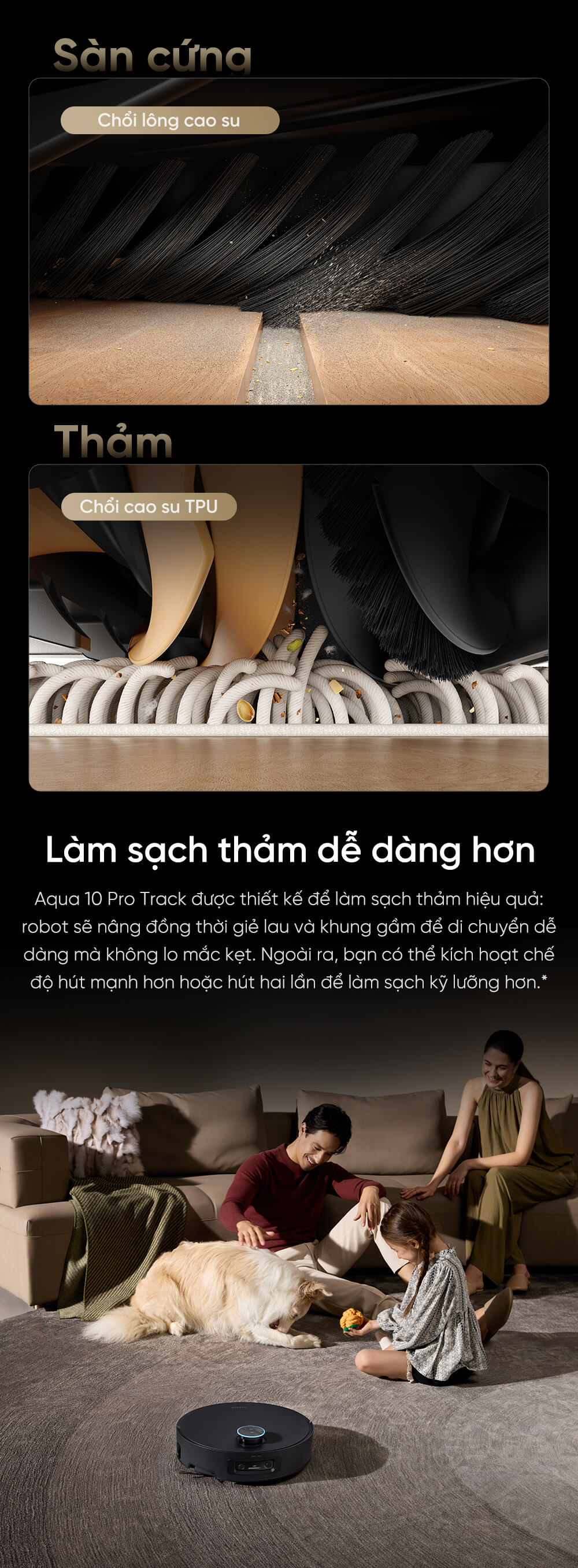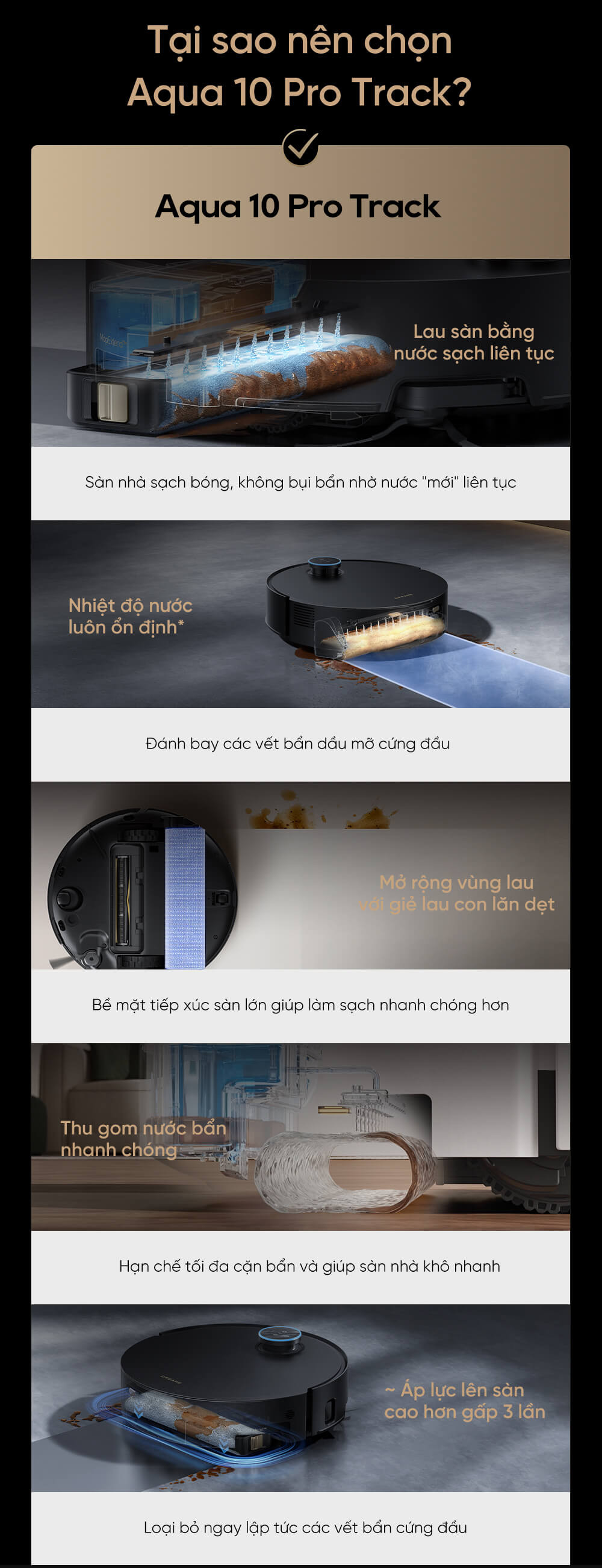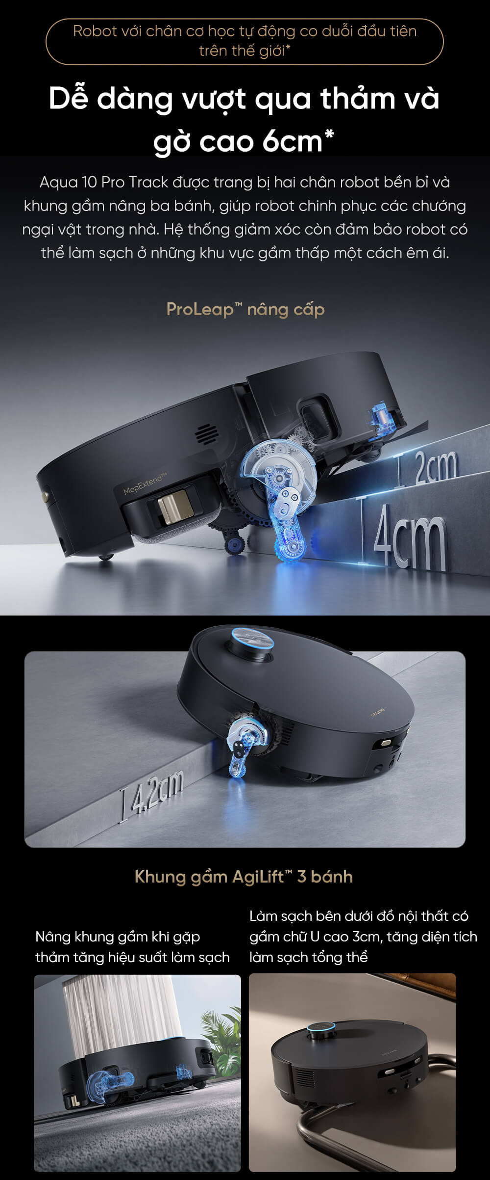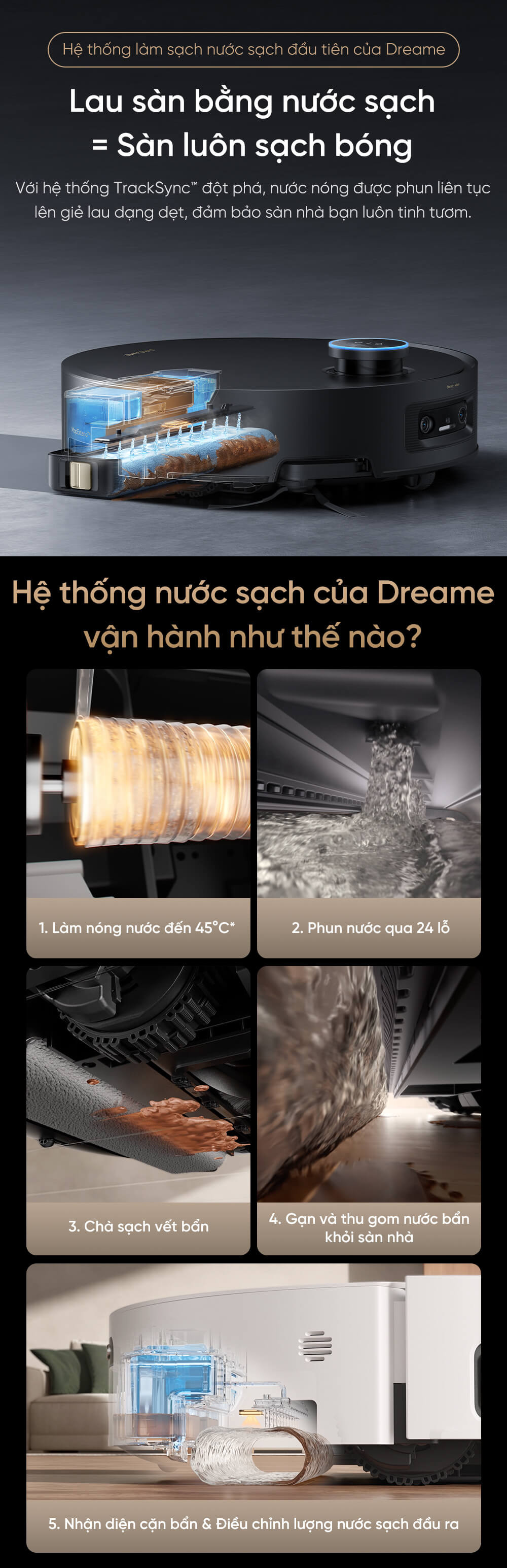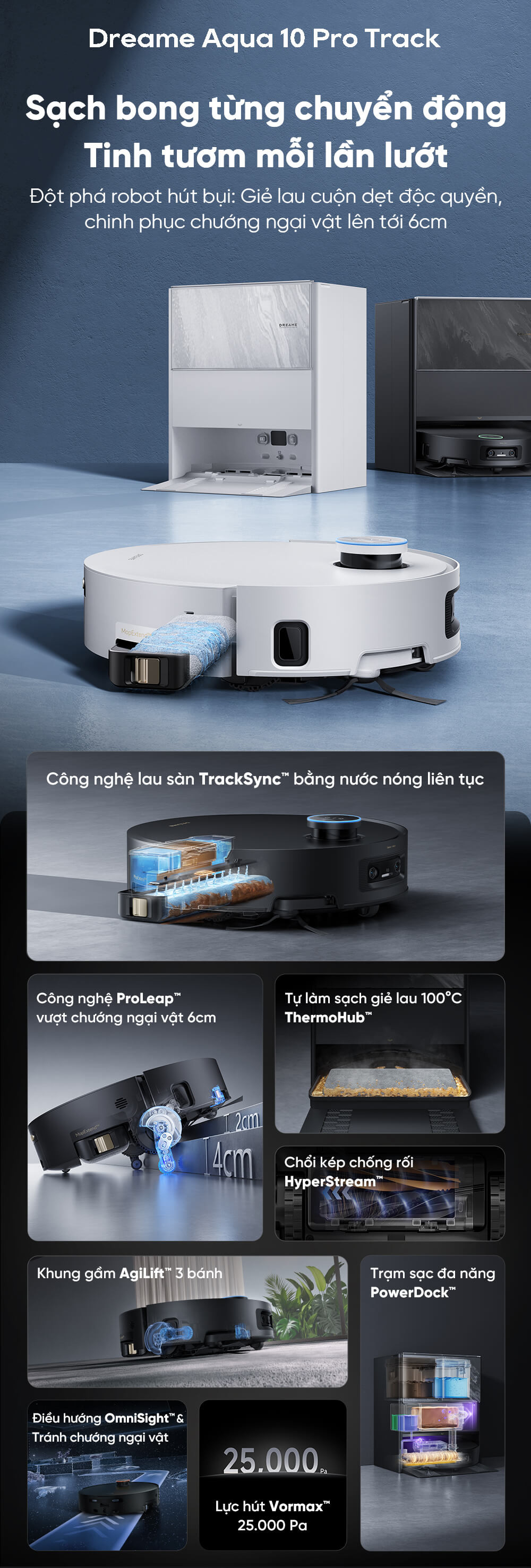 Robot hút bụi lau sàn chuyên dụng Dreame Aqua 10 Pro Track trang bị loạt công nghệ làm sạch hiện đại, Aqua 10 Pro Track mang đến hiệu quả hút – lau vượt trội trên mọi bề mặt. Không chỉ làm sạch sâu, robot còn được trang bị trạm sạc đa năng để sạc pin, làm sạch và sấy khô giẻ lau mà bạn không cần chạm tay. Đây được xem là giải pháp dọn nhà thông minh, tiện nghi và tiết kiệm thời gian tối đa cho gia đình hiện đại. Công nghệ lau sàn nước sạch TrackSync™: Lau sàn nước sạch 45℃ đảm bảo sàn nhà luôn sạch sẽ, sáng bóng