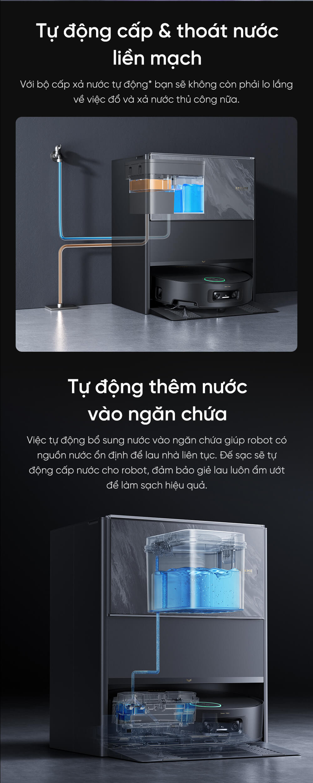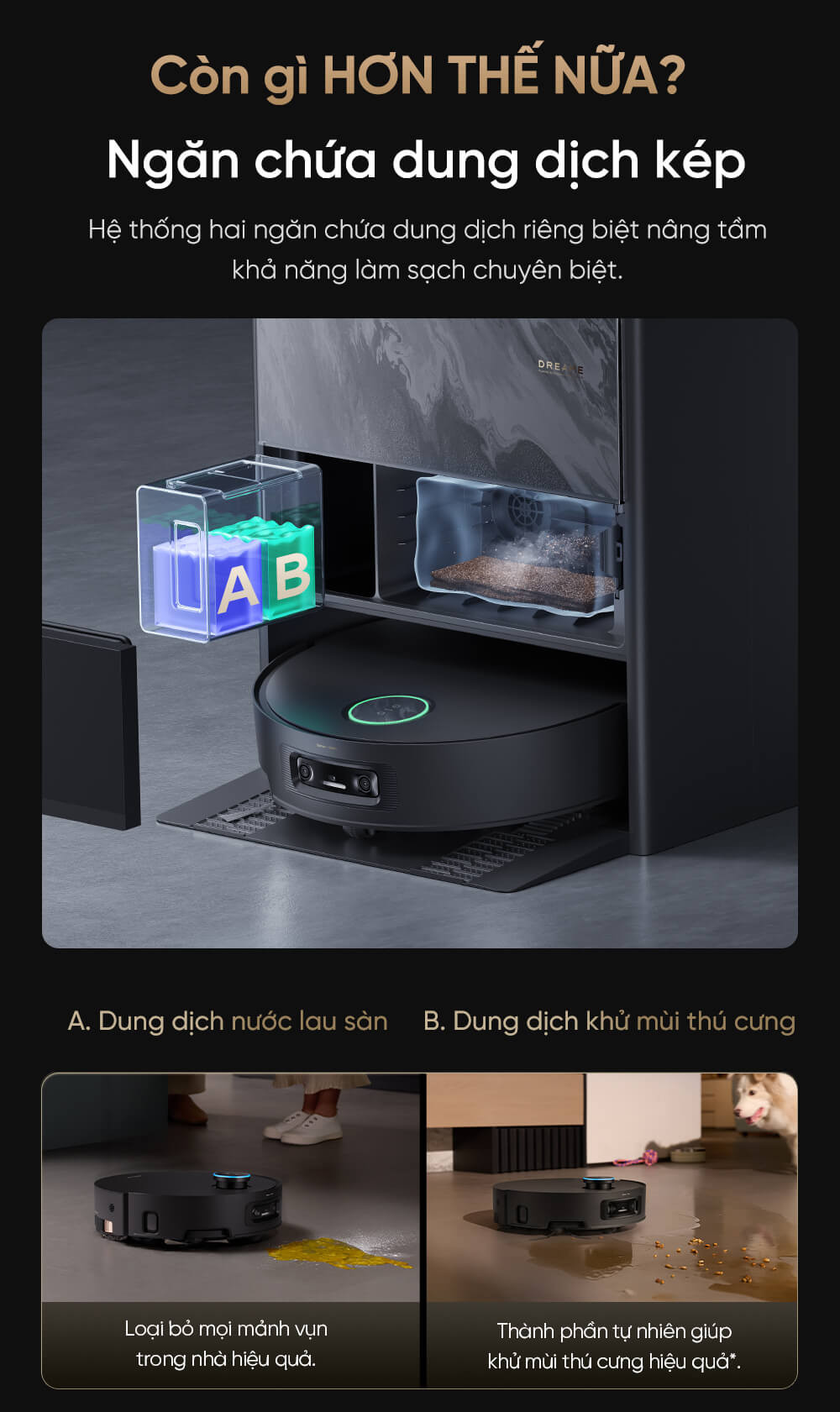- Ngăn chứa kép hai dung dịch làm sạch: 1 là dung dịch khử mùi thú cưng, và dung dịch còn lại là nước lau sàn giúp đáp ứng đa dạng nhu cầu làm sạch.