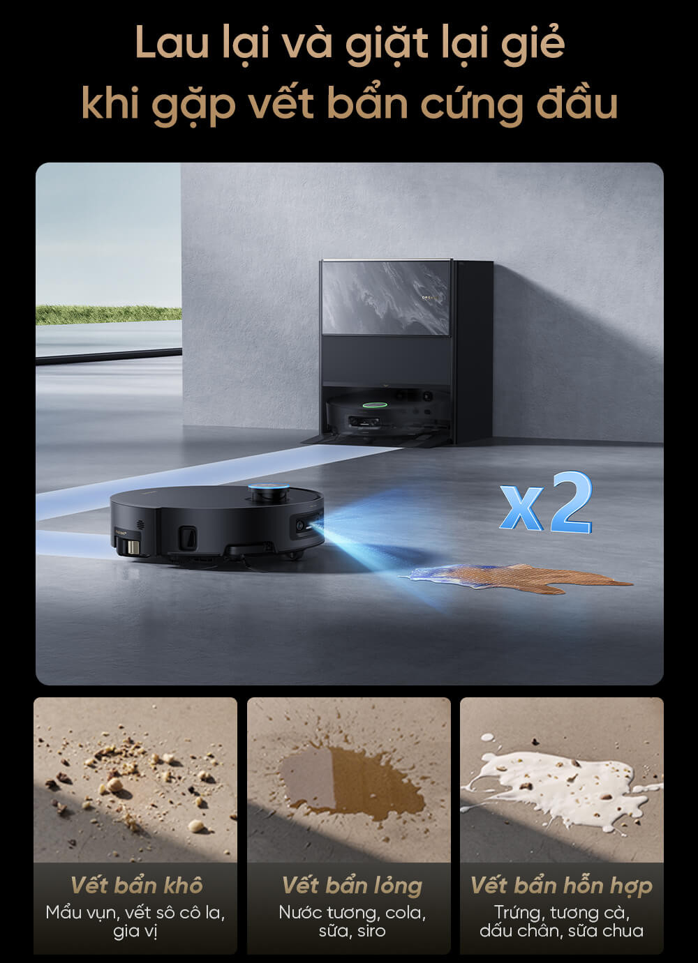 - Giặt con lăn bằng nước nóng 100°C - Sấy khô bằng khí nóng: Có (50°C) - Phát hiện vết bẩn/Giặt lại giẻ và lau lại sàn: Có (đa quang phổ) - Khay giặt tự làm sạch: Có (Khay giặt AceClean - Tự động thêm nước lau sàn - Tự động thêm nước vào bình chứa robot - Hút rác tự động lên túi chứa bụi - Dung tích bình nước sạch/bẩn: 4,5L/4L |