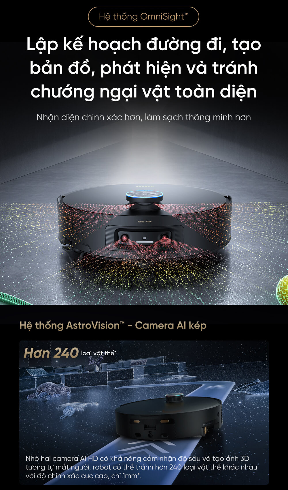 - Hệ thống AstroVision™: Nhờ camera kép AI kết hợp với cảm biến độ sâu và đèn LED giúp robot di chuyển và né tránh vật cản một cách cực kỳ chính xác, đến từng milimet.