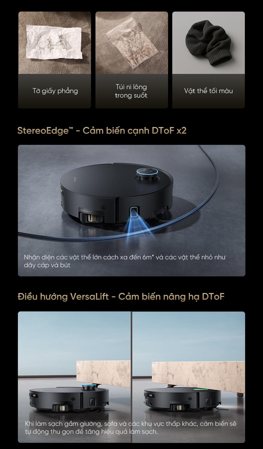 - Công nghệ lau con lăn - Lau nhà bằng nước nóng - Điều hướng VersaLift DToF - Chổi chống rối kép HyperStream - Tránh chướng ngại vật: Camera AI kép + Cảm biến DToF cạnh bên kép + Đèn LED - Nâng chổi chính, nâng chổi cạnh - Mở rộng chổi cạnh, mở rộng con lăn - Hộc nước sạch/nước bẩn: 160ml/150ml - Điều khiển bằng giọng nói: Tích hợp & Bên thứ ba |