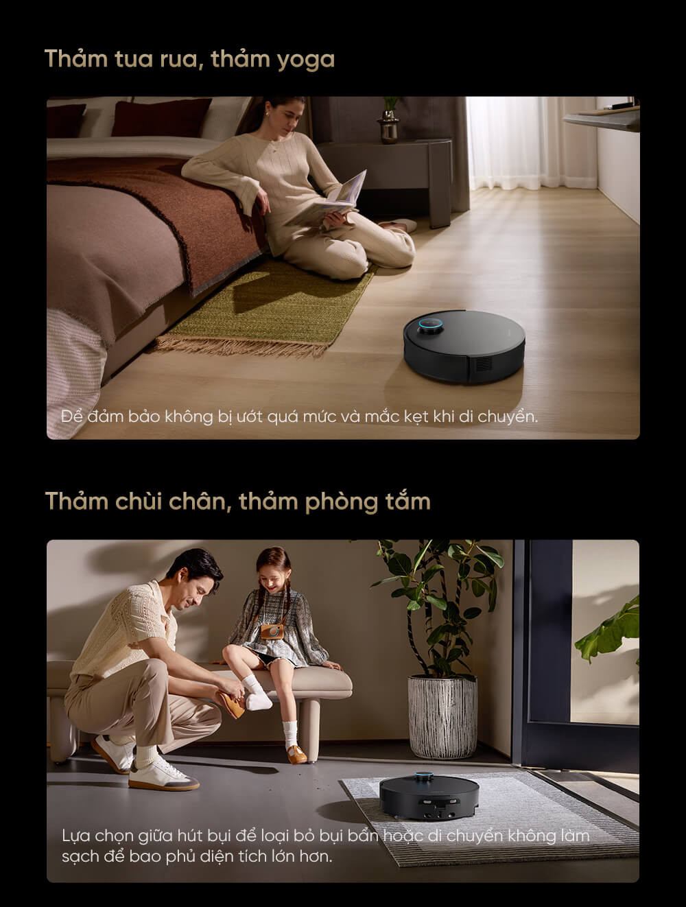 - Làm sạch thảm thông minh: Tùy theo đặc điểm từng không gian sống, người dùng có thể cài đặt các chiến lược làm sạch riêng biệt cho từng loại thảm.