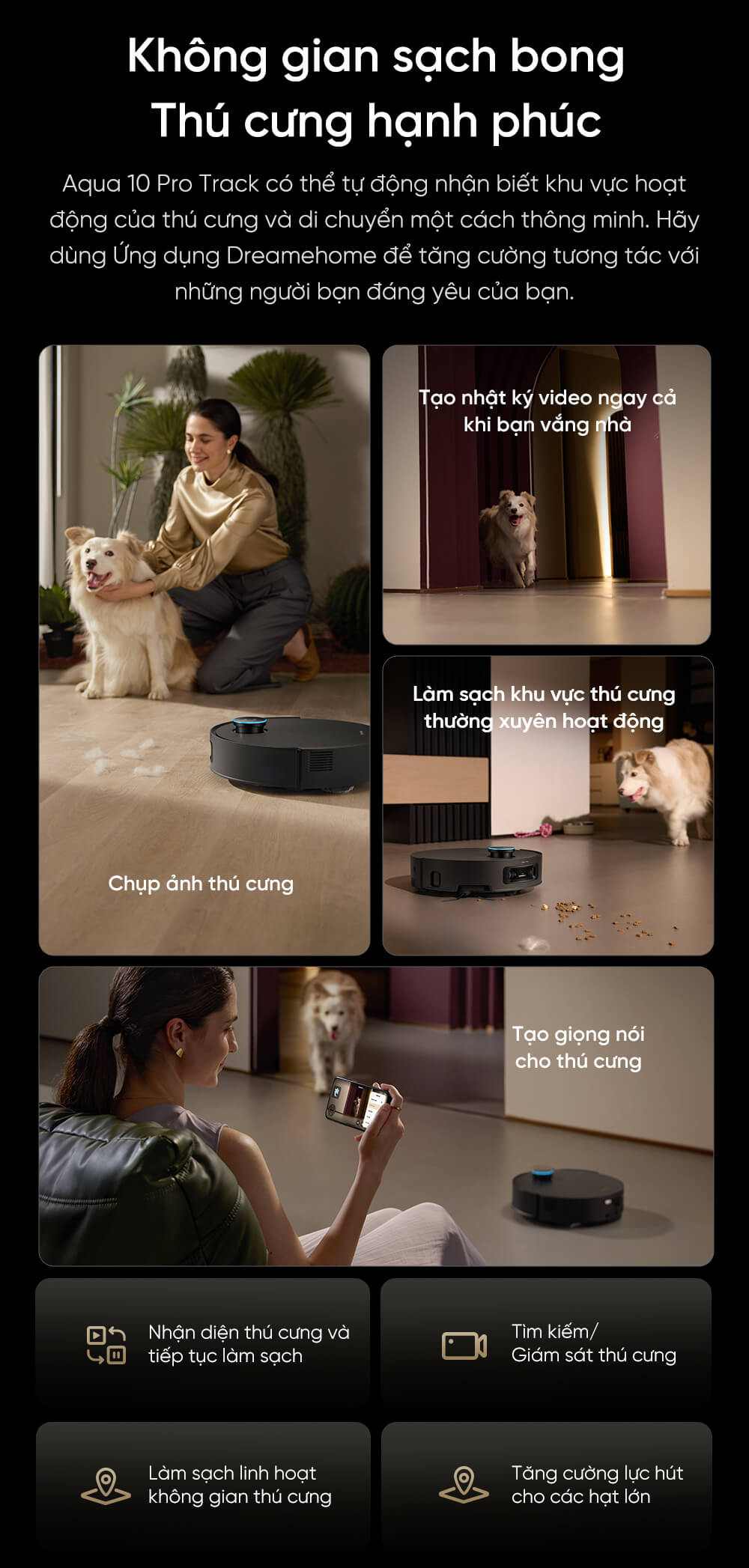 - Điều khiển trực tiếp bằng giọng nói: Nhờ tích hợp Al Action, robot hút bụi có thể tự động nhận diện nguồn âm thanh và sự hiện diện của người dùng để nhanh chóng làm sạch khu vực xung quanh mà không cần phải cài đặt vùng làm sạch thủ công trên ứng dụng.