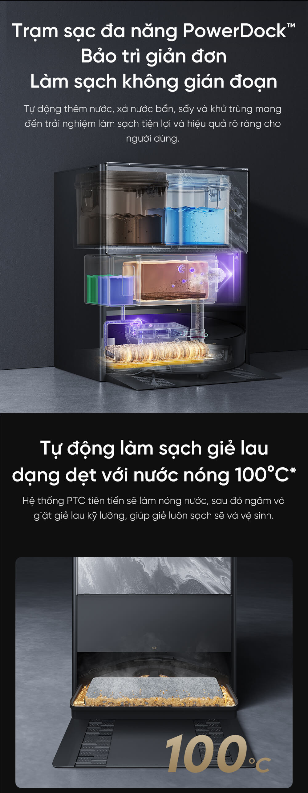 - Tự giặt giẻ lau 100℃ ThermoHub™: Nhờ tích hợp hệ thống PTC vào khay giặt, nhiệt độ bề mặt có thể lên đến tối đa 100°C giúp giặt giẻ lau nhà ở nhiệt độ cao