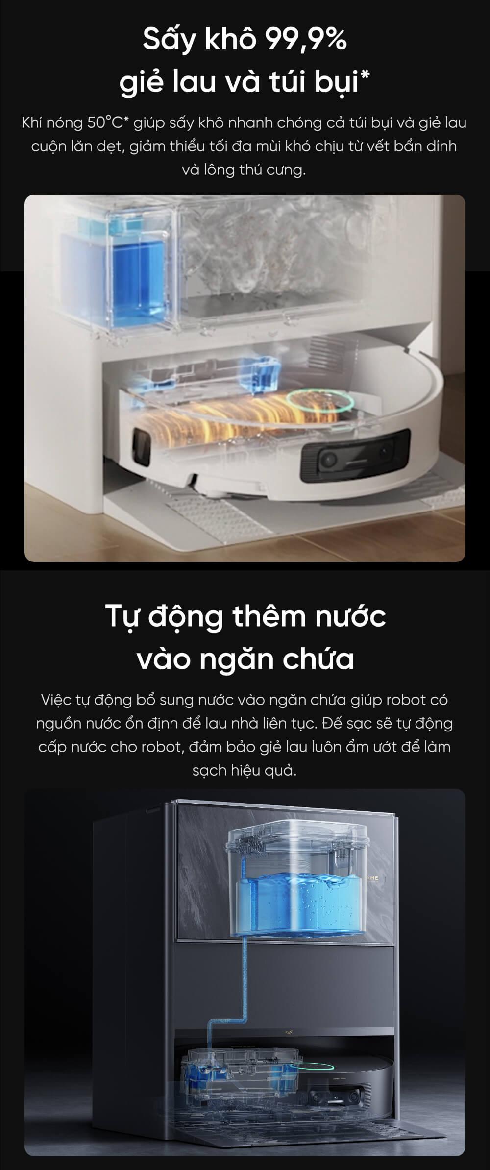 - Sấy khô giẻ lau nhanh và tự động sấy khô túi bụi: Sau khi vệ sinh xong, giẻ lau và túi bụi được sấy khô nhanh chóng bằng khí nóng với độ ồn thấp, không làm ảnh hưởng đến sinh hoạt hàng ngày.
