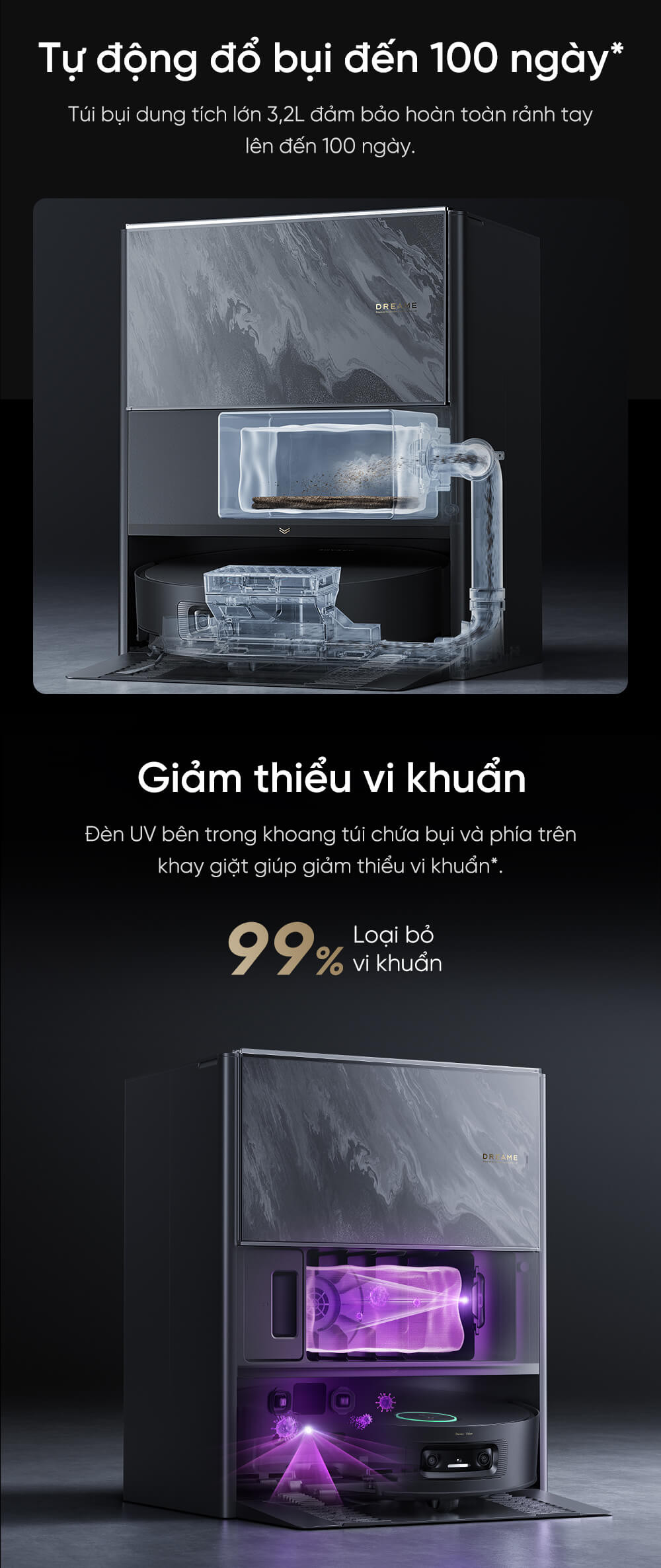 - Công nghệ loại bỏ vi khuẩn: Công nghệ khử trùng bằng tia UV với hai đèn UV (một đèn để khử trùng giẻ lau và đèn còn lại cho túi bụi).