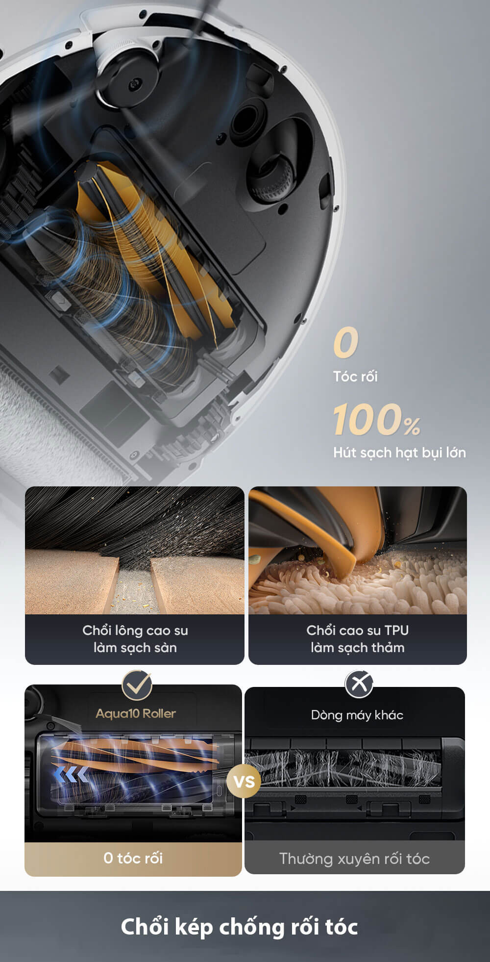 Nhờ thiết kế ống dẫn khí độc đáo, robot dễ dàng hút và loại bỏ tóc/lông mà không bị rối trong quá trình làm sạch. Ngay cả tóc dài 30cm cũng được xử lý dễ dàng.