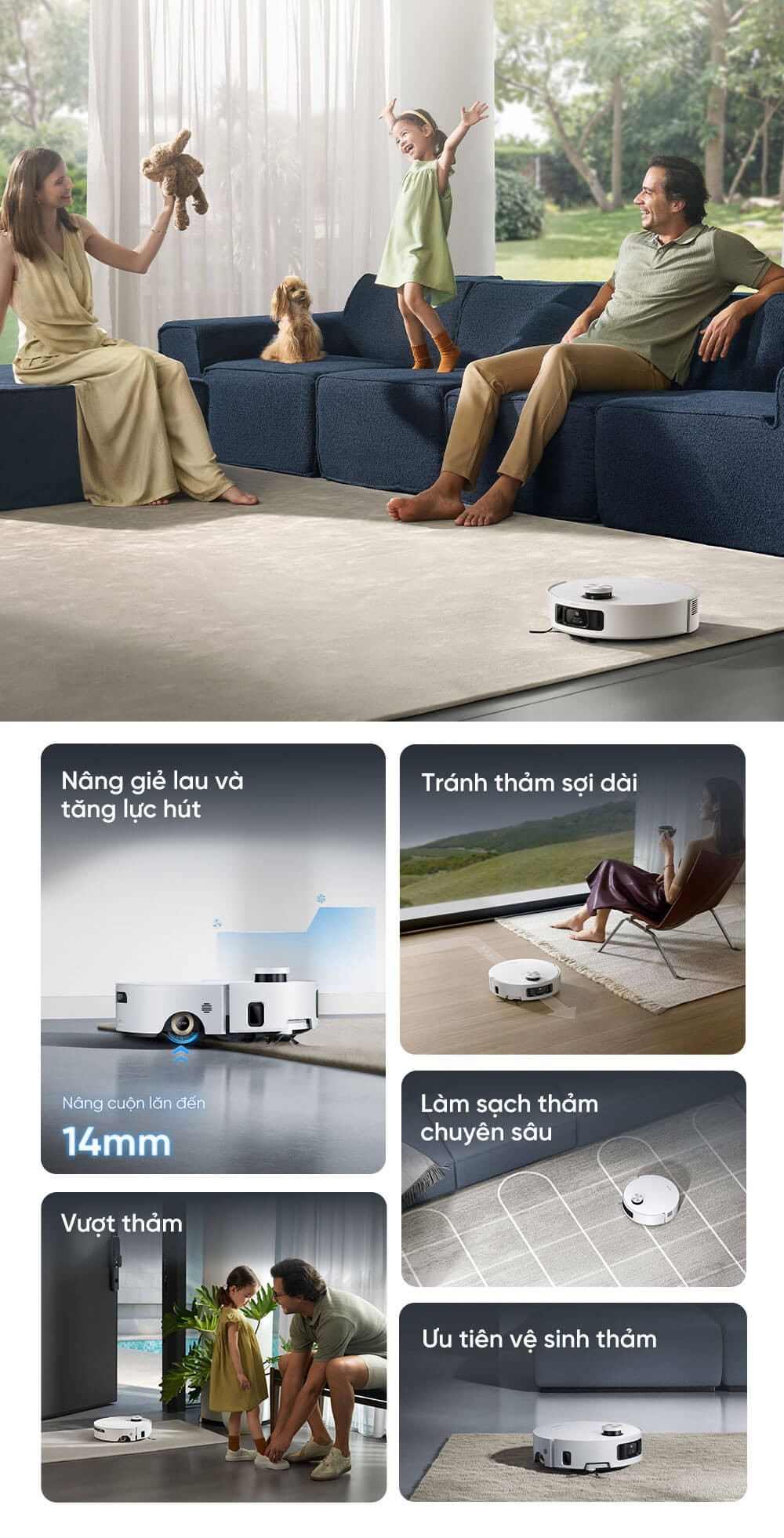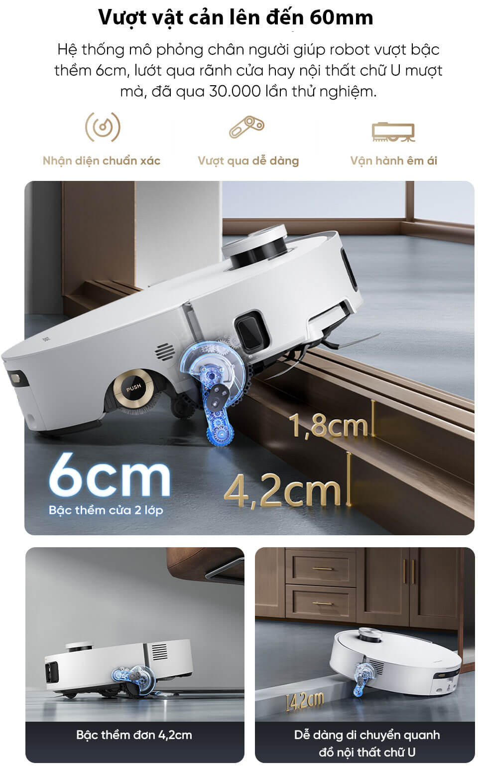 - Hệ thống còn tích hợp giảm xóc thông minh, giúp robot vận hành êm ái, giảm độ ồn tối đa và hạn chế va chạm, mang lại trải nghiệm làm sạch mượt mà và ổn định. Trước khi vượt chướng ngại vật, cảm biến Binocular sẽ phân tích chiều cao vật cản để xác định chiến lược di chuyển phù hợp. Sau đó, cảm biến ToF liên tục đo lường khoảng cách, giúp robot tự động nâng - hạ thân an toàn và chính xác tuyệt đối.