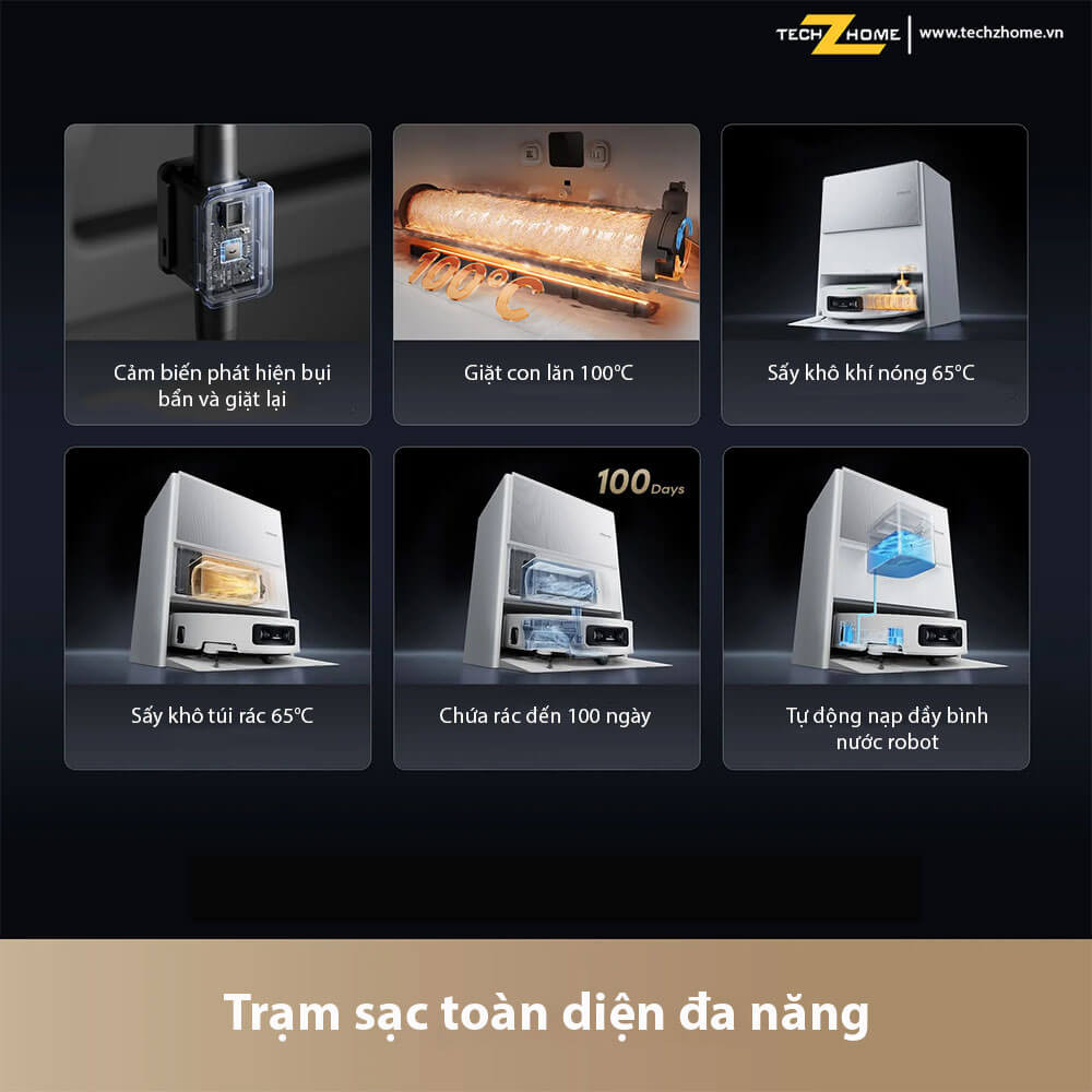 Trạm sạc đa năng toàn diện với chức năng sấy khô con lăn bằng khí nóng 65°C, tự động thêm nước lau sàn, tự động thêm nước vào hộc chứa trên robot, tự động đổ bụi