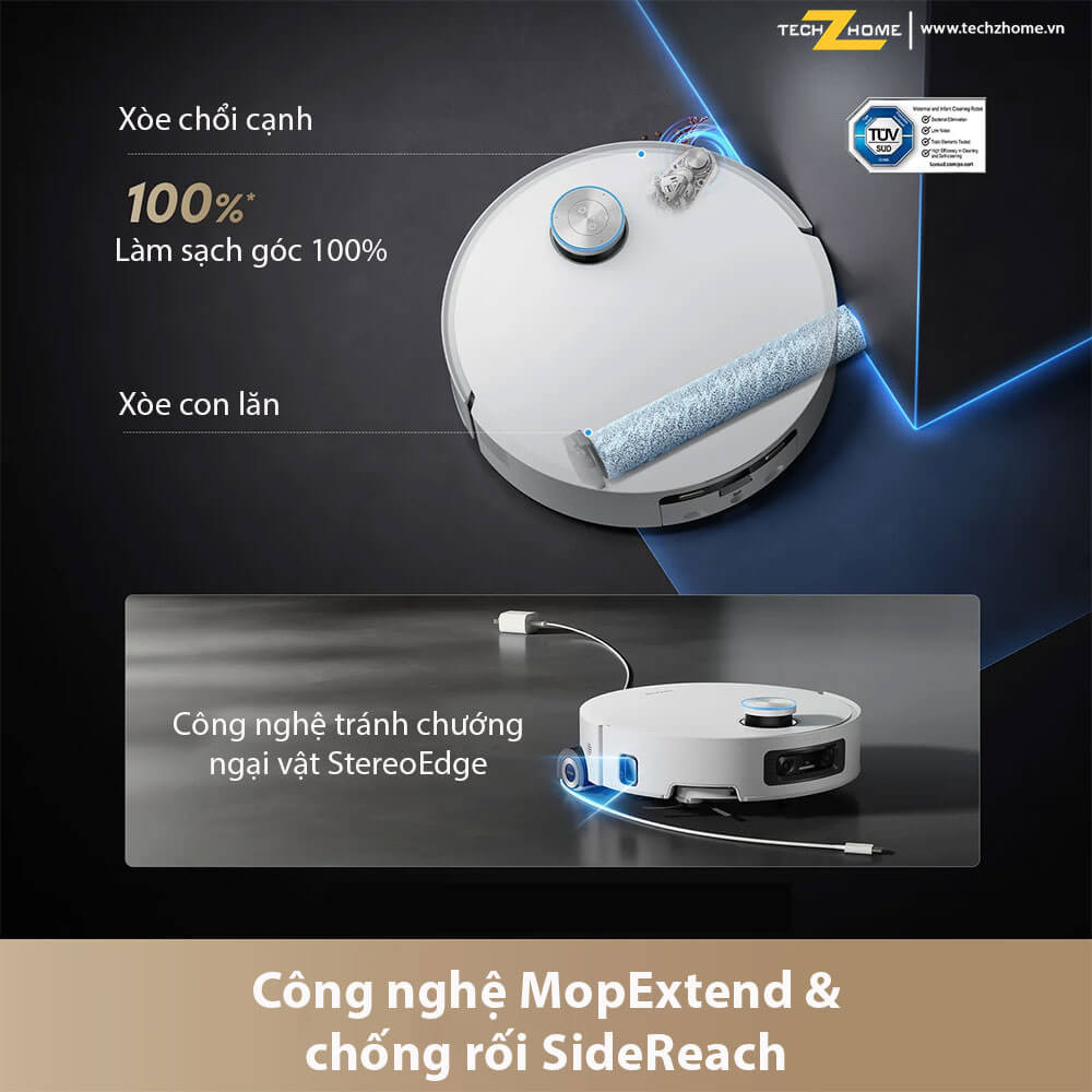 - Công nghệ MopExtend mới nhất dễ dàng xử lý mọi vết bẩn dọc theo các cạnh tường và góc nhà. Robot có thể mở rộng giẻ lau 40mm để làm sạch sát mép triệt để.